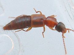 11/04/04 体長約4ミリ。トリケラトプスを連想させる異様な突起はヒラタハネカクシ属に違いないが、上翅端が赤くなる特徴はヒラタハネカクシ、ヒメヒラタハネカクシ、セミゾヒラタハネカクシとも一致しない。 |