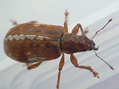 11/04/02 体長3.4ミリ。エゾヒメゾウムシあたりが近いようだが、体色や前胸の点刻の密度が異なるようだ。 |