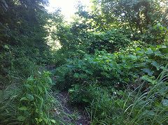 11/07/21 かつて車で頂上まで行けたはずだが、両脇から草木が伸び舗装路は消えていた。「私道に付き事故の責任は負えません」の看板。事故とは転落や交通事故ではなく、追剥やクマとの遭遇を意味するんじゃないかなどと考えてしまった。 |