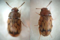 体長4.9ミリ。最近、湿った地面側に菌糸が回ったような太い枝を拾って叩くことが多く、よく落ちる。斑紋の薄い個体だが、側面に遊離した黒点を確実に有する。これが近似種アヤモンニセハナノミとの簡単な判別法だが、誤同定したままの過去画像も多く、早く修正しなければと思っている。