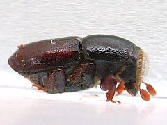 比較用過去画像。体長3.xミリ。河童のお皿みたいに頭頂部はに円形に凹み、その縁から茶髪の長毛が内側に向かって伸び、変化の乏しいキクイムシ科にあって独特の風貌を誇る。生活面でも養菌性キクイムシ類はとてもユニーク。養菌性キクイムシ類の親虫は,いずれもこれらの坑道の中で共生菌の培養管理,坑道内の清掃,換気,温度調整,雨水の流入防止,ダニ類の侵入防止などの作業を行い,幼虫が成虫になるまで付き添って世話をするという。