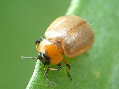 06/07/18 約10ミリの体長や短い触角からハムシの仲間には見えない。頭部がほとんど隠れることや触角が小さいことはテントウムシに擬態している様にもみえる。 |