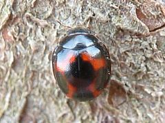 06/04/28 体長2.0〜2.6o 肉眼的には光沢のある暗赤色にみえるが、体があまりにも小さいため、6個の黒紋を確認するのは難しい。 |