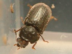 06/10/10 キクイムシ科は体長1〜数ミリ(2ミリくらいが多い)の円筒状の小さな甲虫だが、生活に密着している木材の害虫だけによく研究され現在、国内だけでも300種以上が確認されている。どれも似た形をしているため、画像だけで種を特定するのは無理がある? |