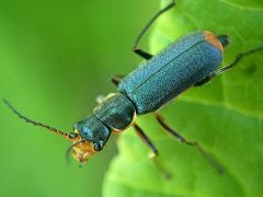 07/05/11 体長約5ミリ。「コガタルリハムシ・・・」と呟きながら手に取ったが、ルリテントウダマシにも似た不思議な雰囲気がある。前胸の形や腹部の縁が黄褐色であることなどからこの種であった。これだけ大きいのにこれまで気が付かなかったのは大量にいるコガタルリハムシと紛らわしいからか。 |