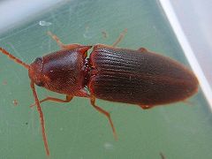 07/07/24 体長8〜9ミリ。ワイン色というか変な赤さのコメツキ。 葉上をよく走る。 |