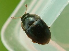 08/05/09 体長3ミリ。いつも頭部は前胸下に隠れている。シルエットからはヌマチビマルハナノミやイシハラチビマルハナノミが考えられるが色彩や長毛の位置など違うようだ。 |