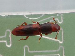 08/10/07 体長3.5ミリ。キクイムシの坑道、朽ち木、樹皮の下、キノコなどにみられるというが、意外にもズボンについていたので飛んできた?。 |