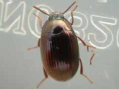 09/06/19 形とか配色はキノコハネカクシ属なのだが体長が5ミリしかない。乾燥標本にするとおそらく3ミリほどに縮むだろう。上翅に片側2列の点刻列がはしる。 |