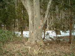 10/03/30 今日もケヤキの樹皮下個体を求めて近くの自然林に来ている。川と断崖が障害となって誰も近づけない広大な場所で、ここはケヤキの大木が散見される。画像は崖側で中央がエゾエノキで右2本がケヤキ、それぞれ径80センチはある。 |