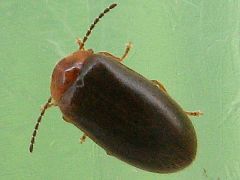 10/06/03 体長3.8ミリ。裏山の積み立て廃階段木材のところに飛んできた。 やはり菌糸の臭いにつられて来たのだろう。ウスオビカクケシキスイともいう? |