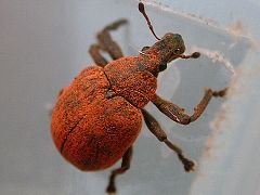 10/06/18 体長4.8ミリ。♀の吻はさらに大きく膨れる(甲雑56版参照)。新鮮な個体はこのように赤い粉を纏う。 |