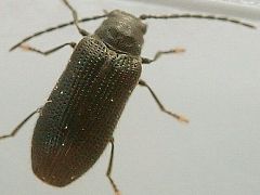 10/06/29 体長10.0ミリ。クリの花のビーティングで多いのがクチブトコメツキやヒメコメツキ。あまりに多いのでパスしているが、たまに珍しい種もまぎれているので一応チェックは欠かせない。そんななか、ん?とチェックに引っかかったコメツキ。普通種といわれるが初めて見る。 幼虫は砂質地の土中に棲息しますので、河原やその周辺で見かけることが多く、森が深くなると少ないです。だそうです。情報ありがとうございます。 |