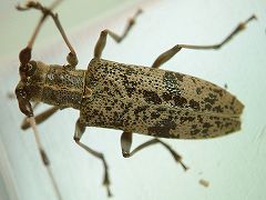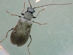 10/06/29 クリの花のビーティングで落ちるとは意外だ。前胸をよくみるとフタコブというものの、実は4つの隆起でできているのが判る。ハナカミキリとしては超大型で、けっこう凶暴なので注意しないと血だらけになるかも。 |