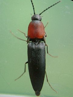 10/06/29 体長16.0ミリ。上の画像とは明らかに異なる膨張する前胸の膨らみ。この個体だけでなく複数得られたので個体奇形ではないと思う。クロツヤハダコメツキの♀形態なのか、あるいは別種なのか? 本種(属)も問題山積みです。雌雄はこれで合ってます。前胸が丸ければ間違いなく 雌ですが、個体差があって雌でもあまり丸くない個体もあります。だそうです。情報ありがとうございます。 |