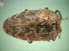 ● 体長約3ミリ。白とオレンジの毛が模様を形成している。肩の張り出しが弱いのでマルガタチビタマムシかとも思われたが生息域が関東以西とあるので否定される。 |