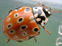 10/07/09 体長6.8ミリ。図鑑では上翅が黒いが、色彩変化があり、この画像のように赤い個体も存在する。♂は甲虫雑感録69版を参照。 |