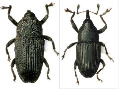 10/07/09 クワヒメハナゾウムシと紛らわしい。図鑑画像では詳しく比較できないので、日本産ゾウムシデータベースからキャプチャーしてきた画像↓を並べて比較した。前胸の点刻の粗さとフタコブ状尻部からこの結論になる。 |